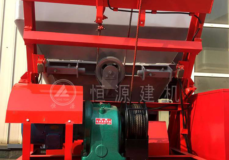 JS500混凝土攪拌機上料系統由卷揚機構、上料架、料斗、進料嘴等部件組成。
